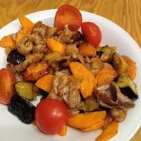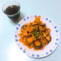 - 4 ナスがしんなりして来たら2を加え、火が通ったらスイートチリソース、ケチャップを加え炒めます。