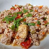 - 5 木綿豆腐に焼き色がついたら、豚ひき肉、(A)を入れ、中火で炒めます。