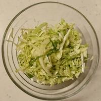 - 2 キャベツは芯を切り落としてバラバラにし、キャベツ、大葉の順に重ね、千切りにします。