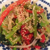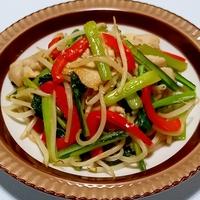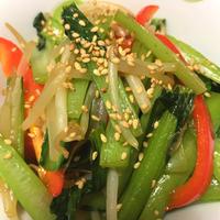 パプリカともやしと小松菜で、彩りの良い中華炒めです。たっぷりのお野菜を炒めるだけで、ごはんのお供にぴったりです。お好みでお肉を入れてもおいしく召し上がれます。とっても簡単なので、ぜひ作ってみてください。