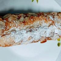 - 2 型に流し込み、アーモンドスライスを乗せ170℃のオーブンで30分焼きます。