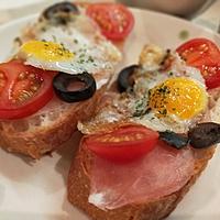 生ハムの代わりにカリカリベーコンを。バケットにマヨネーズを塗ってから、ベービーリーフを乗せて、ベーコン、ミニトマト、ウズラ目玉焼き、ブラックオリーブ、イタリアンパセリを乗せて具沢山バージョン♥