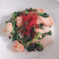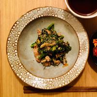 春菊と豚バラ肉の炒め物のご紹介です。豚バラ肉はブロックを使用し、ゴロゴロとした食感もお楽しみいただけるように切りました。ジューシーな豚バラ肉と、少しほろ苦さのある春菊がごまの風味に包まれてとてもおいしいですよ。