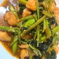 - 5 3を入れ豚バラ肉の色が変わり火が通るまで中火で炒めたら1を加え炒め合わせます。