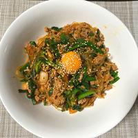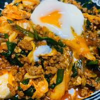 - 7 お皿に盛り付け、温泉卵と白いりごまをトッピングして完成です。