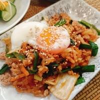 - 6 ニラがしんなりしてきたら、(A)とキムチを入れ中火で炒め、火から下ろします。
