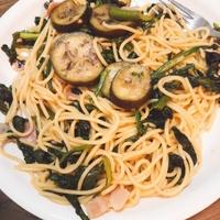 ベーコンを加えてみました!よく味が染み込んだナスと、春菊がアクセントになっていいですね。
