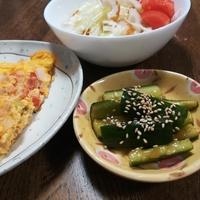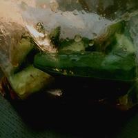 - 4 保存袋に潰したキュウリを入れ、(1)と(2)、合わせ調味料(A)を加え十分揉みます。
