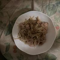 もやしと豚肉やごま油などレシピをみながら作りました。彩りがほしいと思い、ニラを加えました。美味しく頂きました。