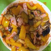 - 1 ズッキーニ、赤パプリカ、黄パプリカ、玉ねぎは1cm角に切ります。