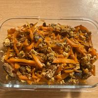 キリのいい分量で炒めるだけだから簡単。にんじんの細切りは冷凍したものをそのまま焼くと時短になってる気がする。