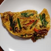 - 6 豚肉に火が通ったら2、1を順に加え、さらに4を入れてひと混ぜし、折り返して両面軽く焼きます。