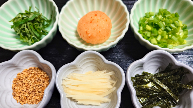ねぎ、生姜、大葉、大根おろし、白ごま、のり、セロリ、パクチー、たまねぎ、にんにく、削り節、唐辛子・七味、ゆず、かぼす |
