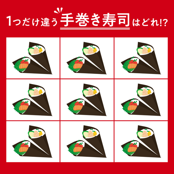 彩り豊かな「手巻き寿司」のイラスト。この中にひとつだけ、ほかと違うイラストが紛れていますよ。さて、どれでしょうか?よーく見比べながら、答えを当ててみてくださいね。
