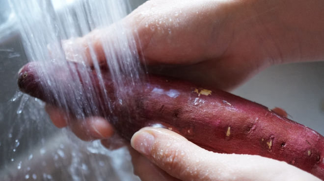 さつまいもは土の中でできるので、きれいに見えても泥汚れがついていることがあります。しっかりと水洗いしてから調理しましょう。ちなみにじゃがいもと違ってさつまいもの芽には毒性はないので、食べても問題ありません。