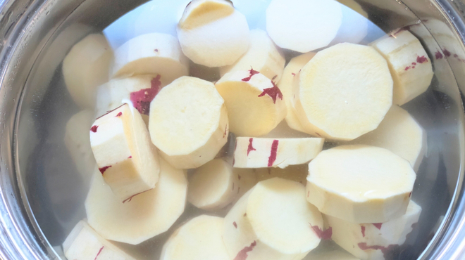 さつまいもは薄い皮の下にアクが多いといわれています。そのため、皮ごと調理するときは、しっかりアク抜きをするのがポイントです。その一方で、長時間水に浸けておくと、水溶性の栄養素が流出してしまうので、アク抜きは10~15分程を目安にするのがおすすめですよ。