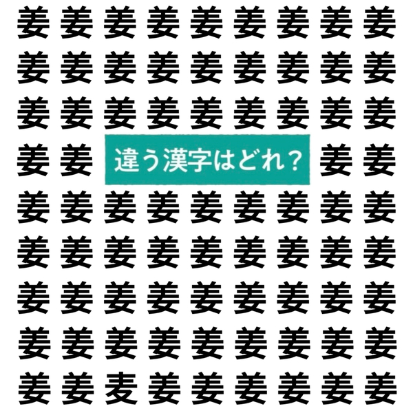 漢字間違い探しです!たくさん並ぶ「姜」の中に、ひとつだけ違う漢字があります。さて、どれが違うか分かりますか?じっくり見比べて、答えを見つけてくださいね。