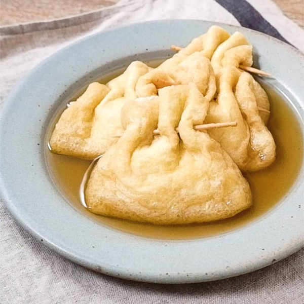 やさしい味わいのチーズ巾着煮のご紹介です。油揚げの中にモッツァレラチーズを詰めて、白だしの風味が効いた煮汁でふっくらと煮込みました。じんわり染み込んだ旨味と、とろりと溶け出すチーズのコクがたまらない一品です。おかずとしてはもちろん、お酒のお供にもぴったりなので、ぜひ試してみてくださいね。