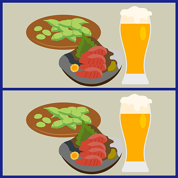 間違い探しです!ふたつの絵には3つ、違うところがあります。さて、どこに違いがあるでしょうか?枝豆、マグロ、ビール、それぞれの絵をよーく見てみると見つかるかもしれません!答え合わせのあとは、クイズにちなんでビールに合うおつまみのレシピをご紹介します。ぜひ最後までチェックしてみてくださいね。