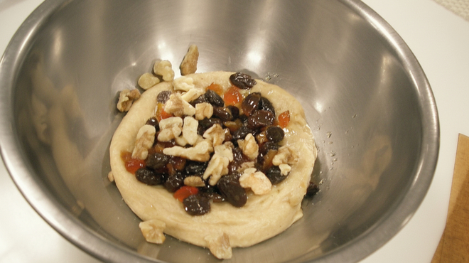 生地の材料は強力粉やパネトーネ種、砂糖、卵、バターなどです。これらを混ぜ合わせて捏ねてから、レーズンやオレンジピールなどのドライフルーツを練りこみます。