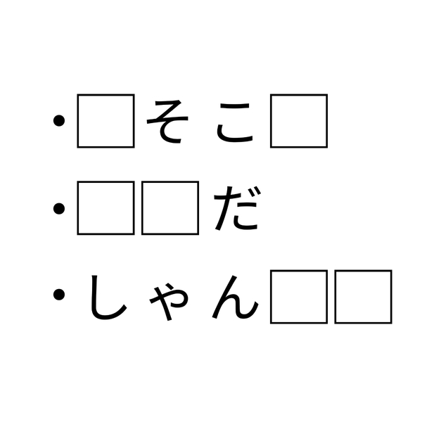 穴埋めクイズです!四角に入る共通の2文字はなんでしょうか?食事にはもちろん、小腹が空いたときのおやつにもぴったりな、ある食材の名前です。いろんな言葉を当てはめて、よーく考えてみてくださいね。