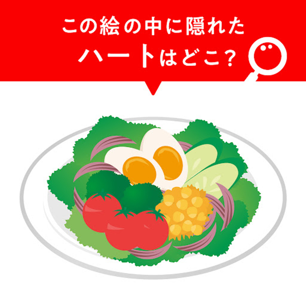 隠し絵クイズです!イラストのサラダに隠れた「ハート」はどこでしょうか?全体をよーく見ながら探してみてくださいね。
