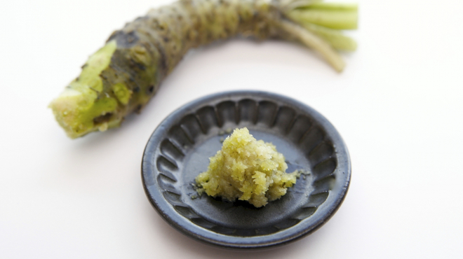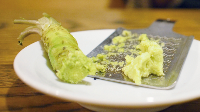 わさびはすりおろして使うのが基本です。根元から先端まで均等にすりおろすことで、香りと辛みが均一に料理に広がります。
