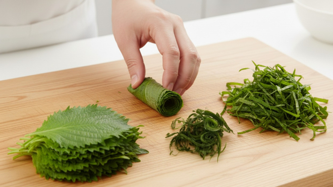 大葉は葉を重ねて軸を切り落とし、丸めて包丁で繊維を断つように細く千切りにします。千切りにすることで、薬味として扱いやすく、香りも立ちやすくなります。料理の仕上げに散らすと、香りと見た目のアクセントになります。
