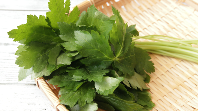 三つ葉は上品で爽やかな香りが特徴の薬味で、「クリプトテーネン」という成分が含まれています。料理の風味を引き立て、刺身や吸い物、和え物に添えると、見た目も香りも楽しめます。