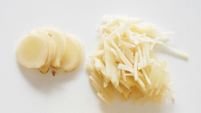 生姜は、まず皮を薄くむき、使いやすい大きさに切ります。次に、平らな面を下にして繊維に沿って細く千切りにすると、薬味として扱いやすく、香りも立ちやすくなります。料理の仕上げに散らすと、香りと見た目のアクセントになります。