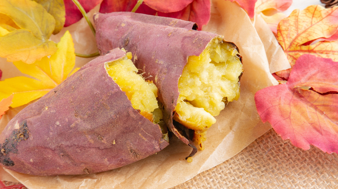 さつまいもは、10~1月頃に食べ頃を迎える秋の味覚の一つです。実際に収穫される時期は8~11月頃で、収穫されたばかりのさつまいもは水分を多く含んで甘みが少なめ。2~3か月ほど貯蔵することで水分が抜け、甘みが増して秋にちょうど食べ頃となります。