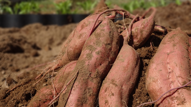 8~11月頃に収穫されるさつまいもですが、苗の植え付けは5月頃で、約5か月かけて育てます。肥沃な土で育てると「つるボケ」といってつるばかりが伸び、さつまいもの生育が悪くなるため、肥料は最小限にし、通気性のよい乾燥した土で育てるとおいしいさつまいもが収穫できます。