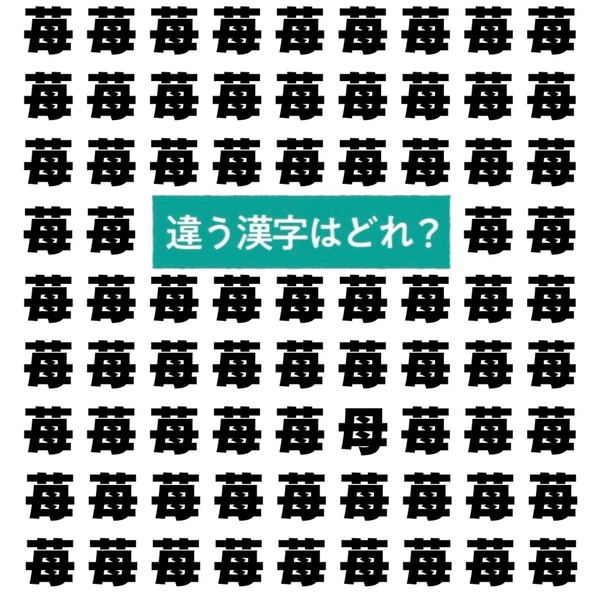 漢字間違い探しです!たくさん並んだ「苺」の文字。この中に、ひとつだけ違う漢字がまぎれこんでいますよ。さて、どれでしょうか?よーく見比べながら、答えを当ててみてくださいね。