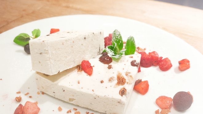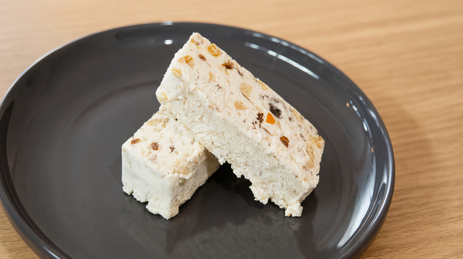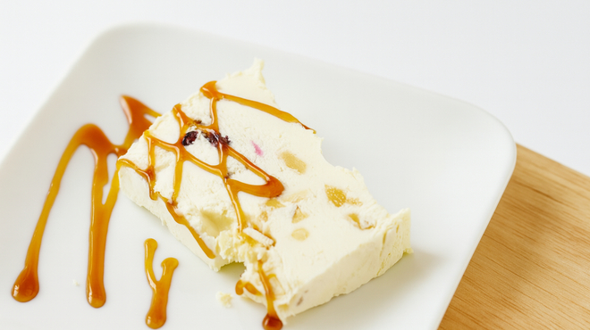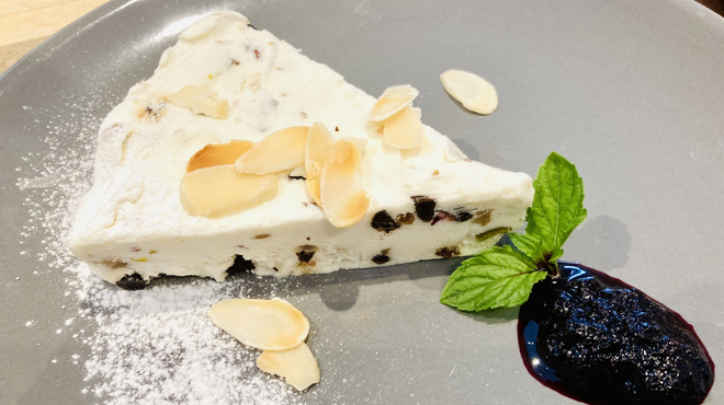 リコッタチーズや生クリームを混ぜ合わせたクリームに、ナッツやドライフルーツ、チョコレートなどを刻んで混ぜ込み、冷やし固めて作るいわゆるアイスケーキのようなものです。型に流し入れて冷やし固めるので、食べるときはお好みの厚さにカットしていただきます。