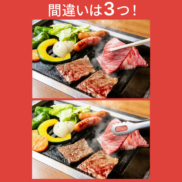 間違い探しにチャレンジ!おいしそうな焼肉の写真がふたつ並んでいます。じつは、このふたつの写真の中に違うところが3か所あるのですが、みなさんどこかわかりますか?よーく見比べて、違いを探してみてくださいね。