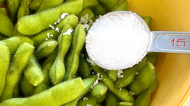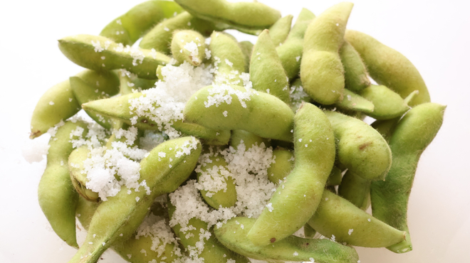 枝豆には産毛が生えています。皮ごと食べるころが多いので、口当たりをよくすためにもここで枝豆に塩を振りかけて揉み込む「塩もみ」をしましょう。また、サヤの両端を切り落としてから塩もみすることで味が浸透しやすくなり、色味も鮮やかに仕上がります。