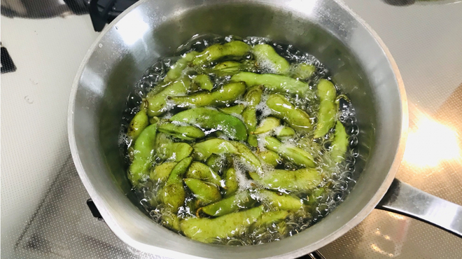 鍋にお湯を沸かしたら茹で用の塩を加え、そこに枝豆を入れて3〜5分ほど茹でましょう。3分くらい経ったら1つ味見をしてかたさを確認するのがおすすめです。お好みのかたさになるまで茹でてくださいね。