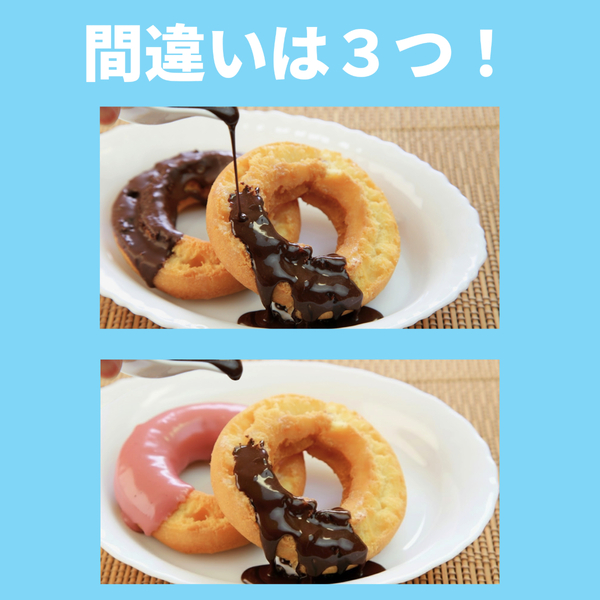 間違い探しにチャレンジしてみませんか?こちらのふたつ並んだドーナツの写真の中には、3つ間違いがあります。いったいどこか、みなさんはすぐにわかりますか?よーく見くらべて、答えを当ててみてください!