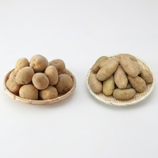 左の丸みのあるものは「男爵」、右の細長いものが「メークイン」です。メークインは粘質で加熱しても煮崩れしにくく、しっとりとした食感が特徴。そのため、煮込み料理のカレーにはメークインが向いています。一方、男爵は粉質でホクホクとした食感になりやすく、コロッケやマッシュポテトなど、つぶして使う料理に適していますよ。