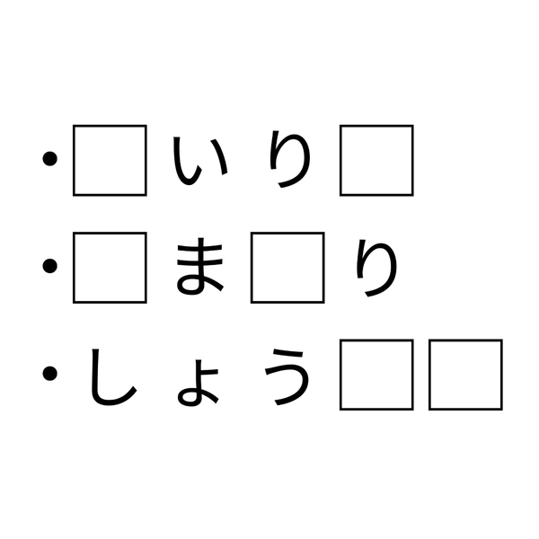 穴埋めクイズです!四角に入る共通の2文字はなんでしょうか?秋になると食べたくなる、あの食べ物の名前です。いろんな言葉を当てはめて、よーく考えてみてくださいね。