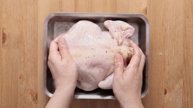 丸鶏のお腹の中の汚れを落とすため中までよく洗い、キッチンペーパーで水気をとります。それから、ハーブソルトと黒こしょうをすり込み、味をよく染み込ませるためにラップをかけて冷蔵庫で1時間ほど寝かせます。