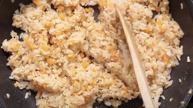 フライパンに有塩バターとすりおろしニンニクを入れて中火にかけ、香りがたってきたらみじん切りにした玉ねぎと人参を加えて炒めます。ごはんとしょうゆ、塩、黒こしょうを加えて炒めます。このレシピでは、日本人の舌にも馴染みやすいバターしょうゆ味に仕上げました。