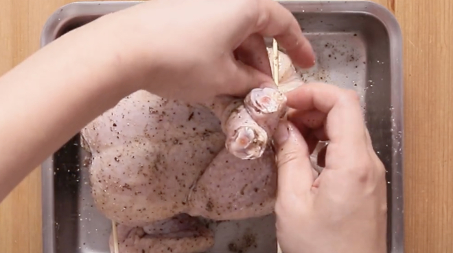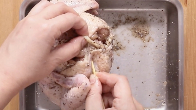 ガーリックライスを中に詰めたときに出てこないよう、丸鶏の首元を竹串を使って閉じます。首元の肉は厚みがあるので、竹串を1ヶ所に刺すだけでもしっかりと閉じられますよ。