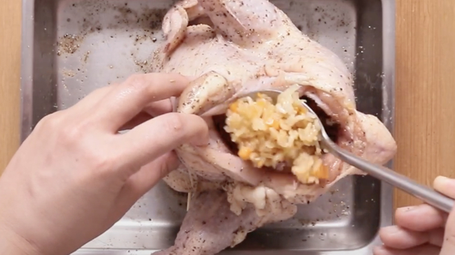 丸鶏のお尻側からお腹の中にガーリックライスを詰めます。丸鶏は内臓を取り除いた状態で売られていることがほとんどなので、中に詰め物を入れるとふっくらと見栄えよく仕上がります。今回はガーリックライスを入れましたが、野菜だけを入れたりパンを入れたりすることもあるんですよ。お好みのハーブやスパイスを使えば、バリエーションも広がります。