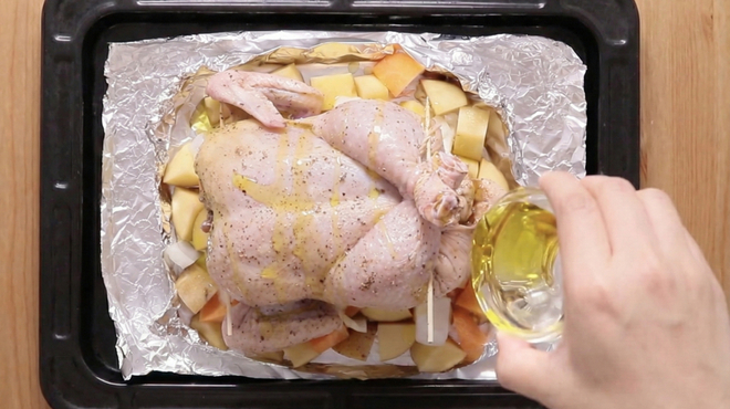 アルミホイルを敷いた天板に、一口大に切ったじゃがいもと人参、玉ねぎを敷いてガーリックライスを詰めた丸鶏をのせ、オリーブオイルをかけます。ローズマリーとタイムものせることで臭み消しと香りづけができるので、よりおいしく仕上がりますよ。