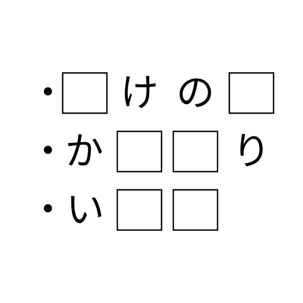 穴埋めクイズです!四角に入る共通の2文字はなんでしょうか?歯ごたえがあって旨味たっぷりな、ある食材の名前です。いろんな言葉を当てはめて、よーく考えてみてくださいね。
