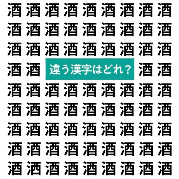 漢字間違い探しです!たくさん並ぶ「酒」の中に、ひとつだけ違う漢字があります。さて、どれが違うか分かりますか?じっくり見比べて、答えを見つけてみてくださいね。