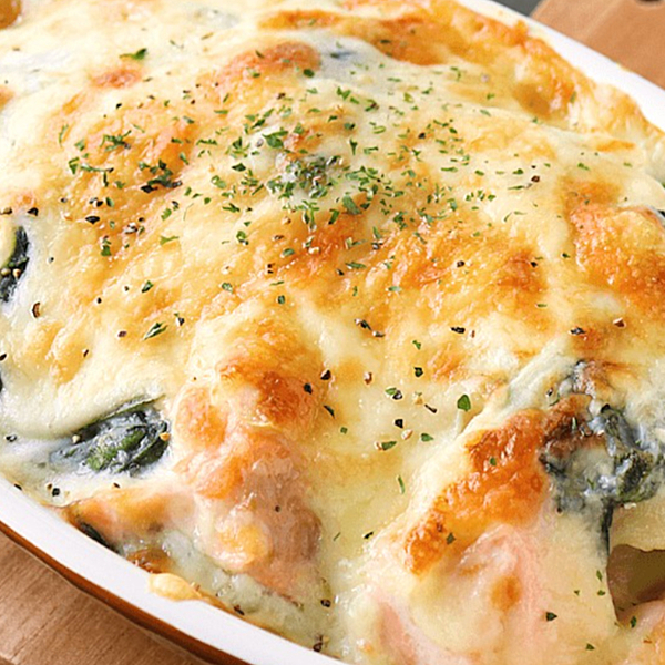 トロトロチーズの味わいがクセになる、鮭とほうれん草のポテトグラタンを作ってみませんか?旨みたっぷりの鮭とさっぱりとした味わいのほうれん草が、濃厚な味わいのホワイトソースと相性抜群の一品です。ホクホク食感のじゃがいもがおいしく、お子様にも喜ばれますよ。ぜひ献立に取り入れてみてくださいね。