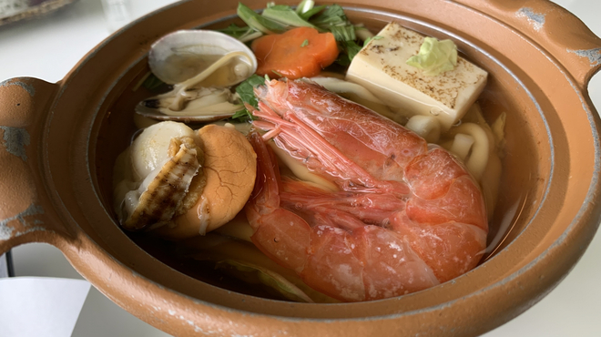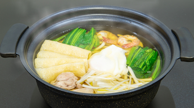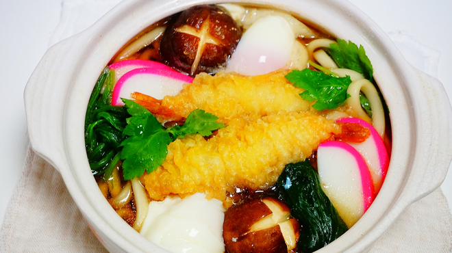 エビを入れると鍋焼きうどんの風味がさらにアップします。
