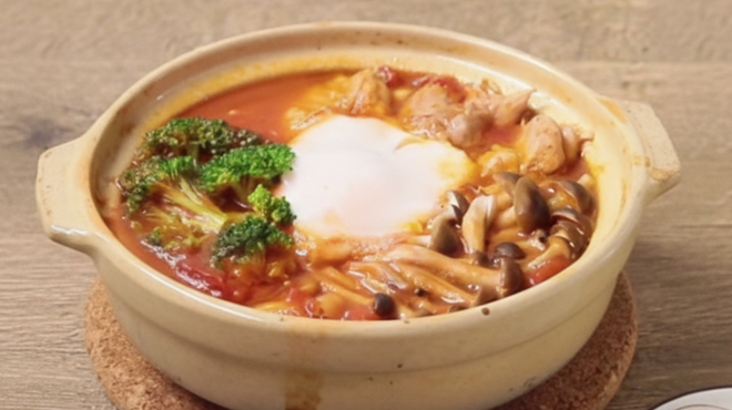 鍋焼きうどんを洋風にアレンジしてみましょう。カットトマト缶やコンソメ顆粒で味つけをしました。トマトの酸味や鶏肉の旨味が溶け出しただし汁が、うどんと相性抜群!簡単に作れて彩りもよいので、忙しい日のランチにもおすすめですよ。